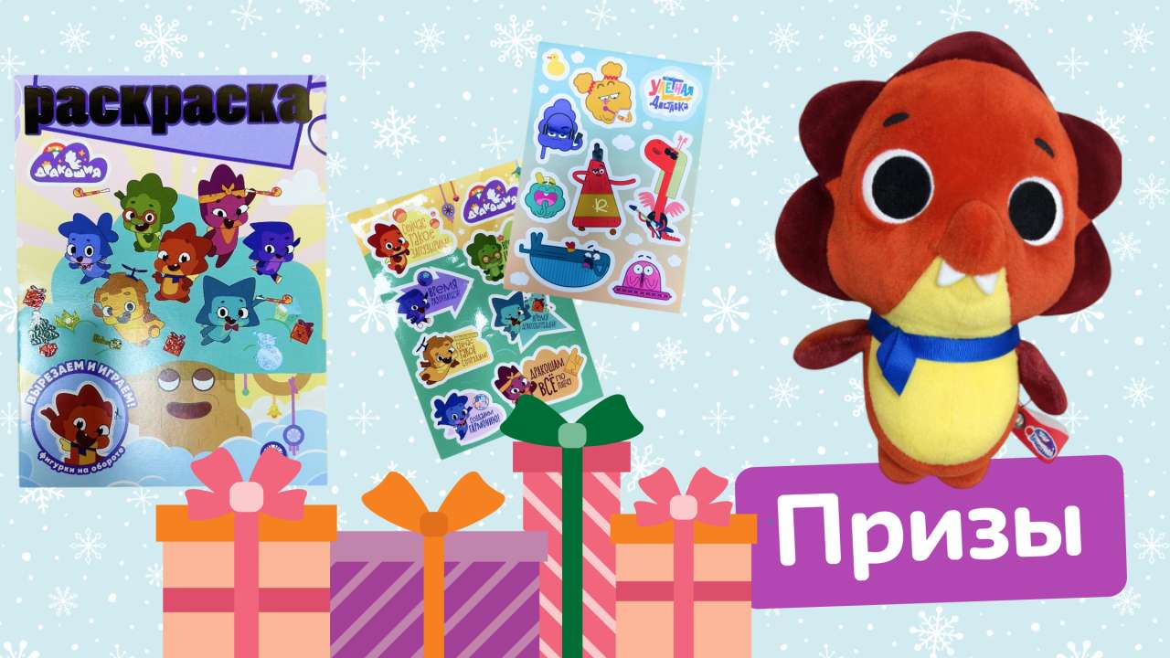Набор призов от мультсериалов «Дракошия» и «Улетная доставка»: мягкая игрушка Дракоша, футболка, наклейки и раскраска. У нас 2 приза для 2 победителей.