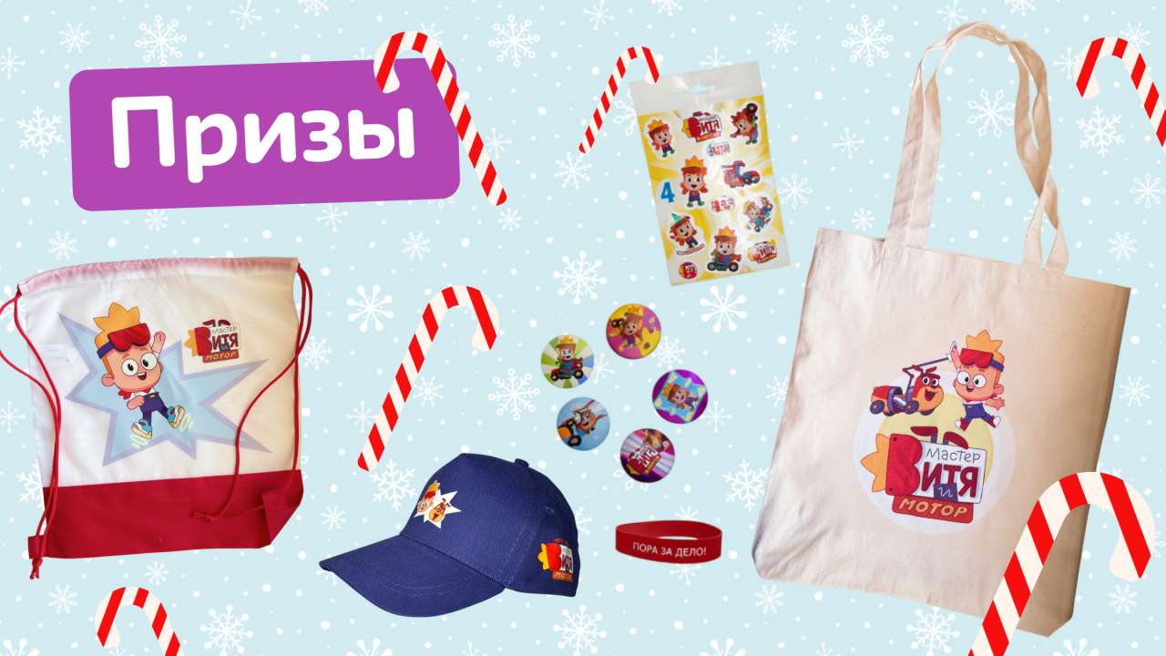 Набор подарков от героев мультсериала «Мастер Витя и Мотор»: кепка, сумка для сменки, шопер, значки, наклейки, фликер и браслет. У нас 4 приза для 4 победителей.