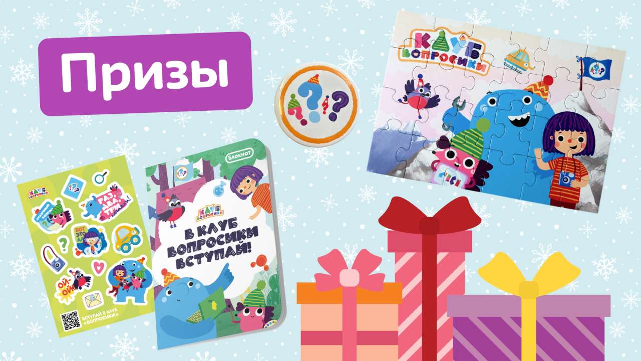 Набор сувениров от персонажей мульсериала «Клуб „Вопросики“»: блокнот, пазл, наклейки, значок. У нас 10 призов для 10 победителей!