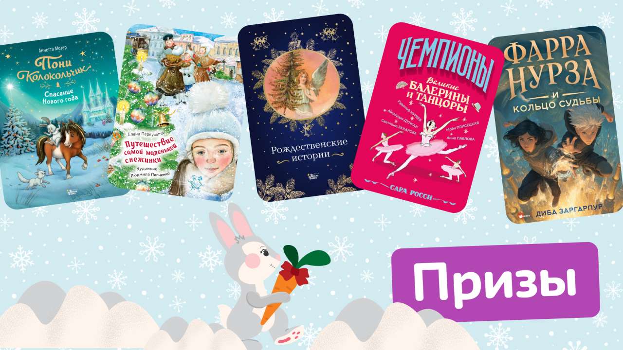 Набор книг от издательства АСТ: «Пони Колокольчик. Спасение Нового года» Аннетты Мозер (6+), «Путешествие самой маленький снежинки» Елены Первушиной (6+), «Великие балерины и танцоры» Сары Росси (6+), сборник «Рождественские истории» (6+), «Фарра Нурза и Кольцо судьбы» Дибы Заргарпур (12+).