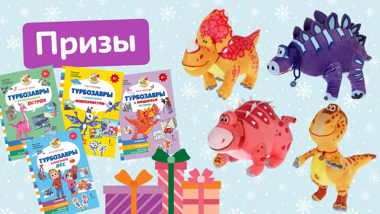 Набор подарков от мультсериала «Турбозавры»: плюшевый турбозавр и комиксы. У нас 4 приза для 4 победителей.