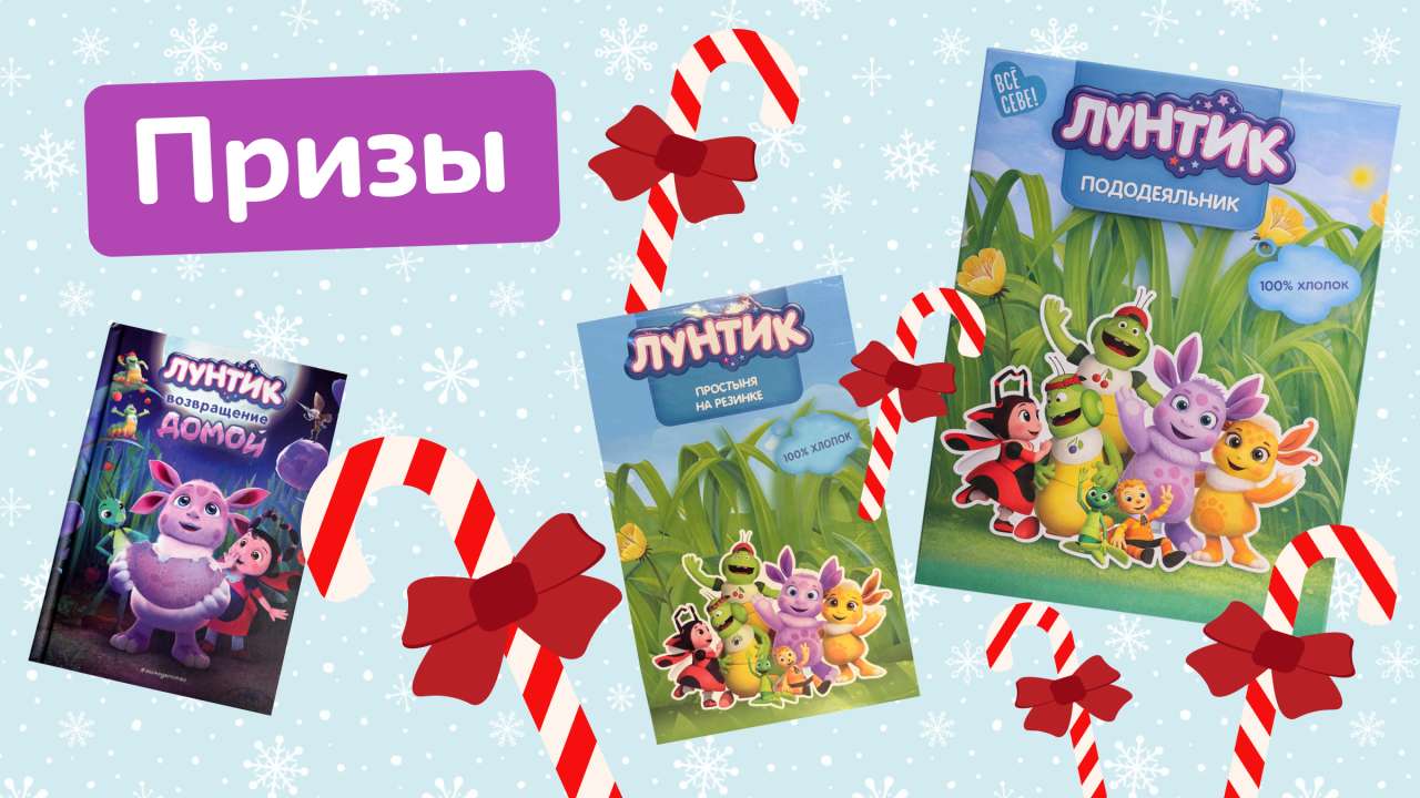 Подарки от героев мультсериала «Лунтик»: набор постельного белья и книжка. У нас 2 приза для 2 победителей.