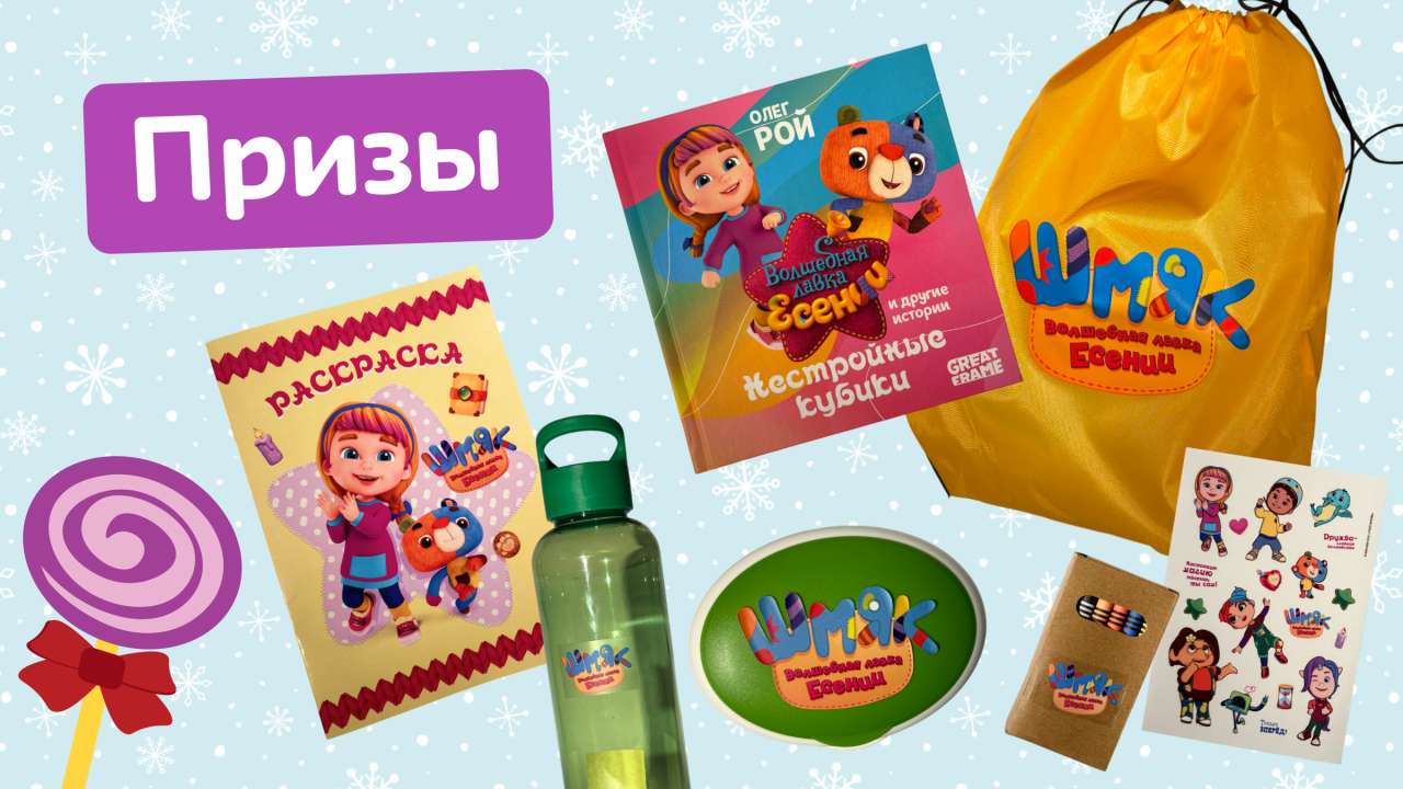 Набор подарков от мультсериала «Шмяк. Волшебная лавка Есении»: бутылка для воды, ланчбокс, мешок для обуви, книжка и раскраска. У нас пять призов для пяти победителей.