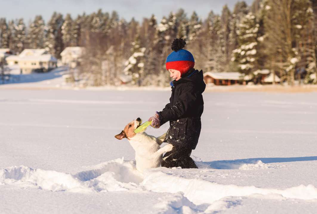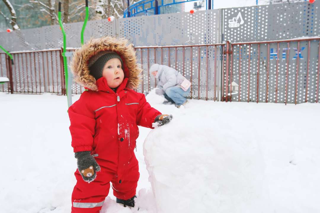 Одевайте детей слоями (термобелье, флис, непромокаемая верхняя одежда), не забывайте про варежки (и запасные тоже) и прикрывающую шею и подбородок манишку (это удобнее и безопаснее, чем длинный шарф). Каждые 30−40 минут заходите в тепло на короткую разминку и проверяйте, не замерзли ли ручки и щечки. Согреться поможет активная игра, а не стояние на месте!