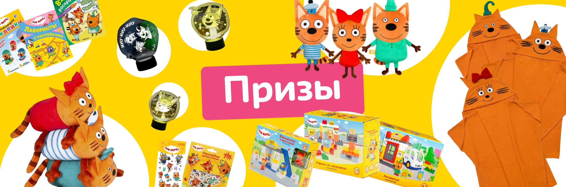 1 место (3 победителя): конструктор «Три кота», большая игрушка-подушка, купальное полотенце, раскраски и наклейки.
