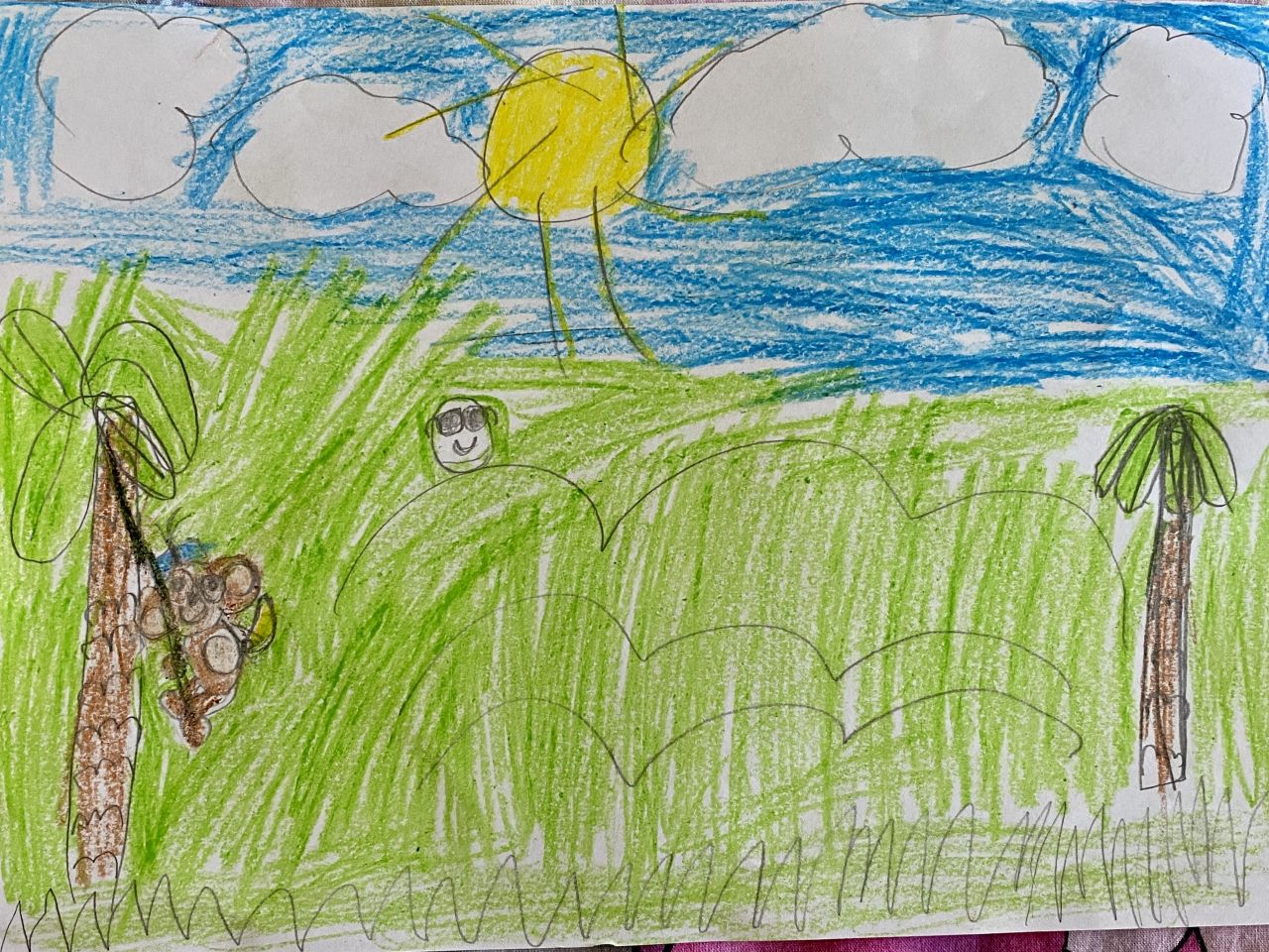 Яна держится за лиану и хочет съесть банан, Петя греется на солнышке